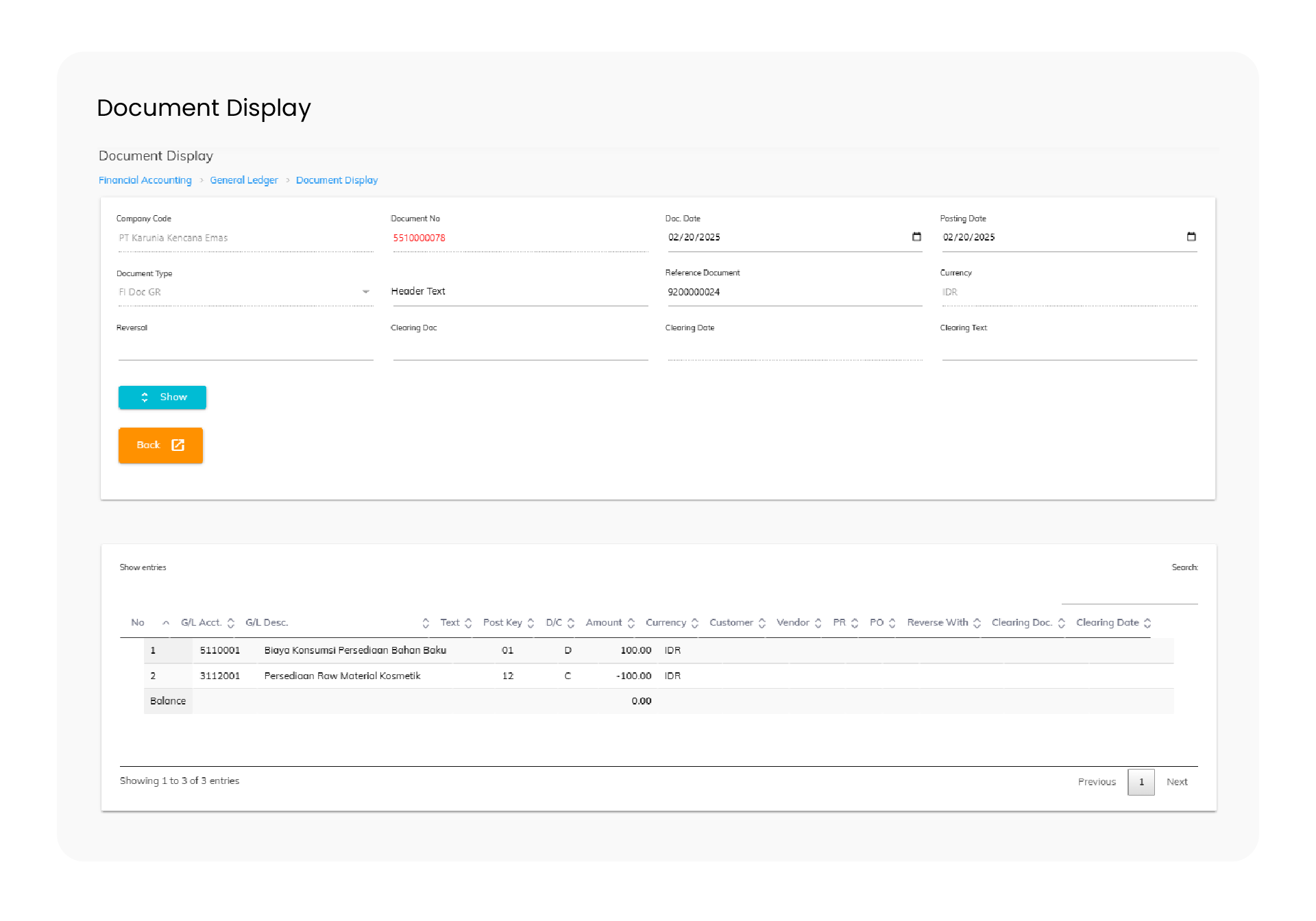 Menu Document Display dari Modul Financial Accounting ditujukan untuk mencatat transaksi keuangan yang terposting secara otomatis untuk proses Goods Receipt dan Goods Issue sesuai dengan mapping yang sudah dibuat oleh team Finance