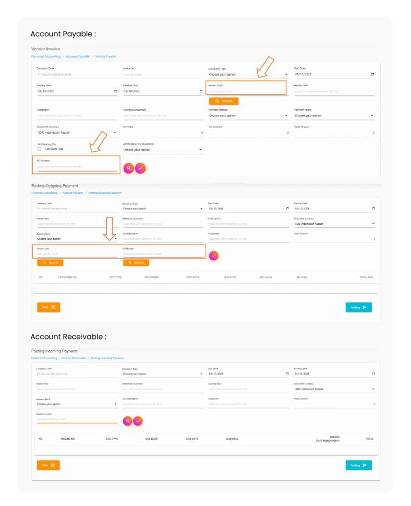 Menu Account Payable dan Account Receivable ditujukan untuk mendokumentasikan transaksi keuangan baik yang masuk atau yang keluar dari Perusahaan yang terintegrasi dengan dokumen pendukungnya untuk menghindari terjadinya kesalahan dalam posting transaksi keuangan.
