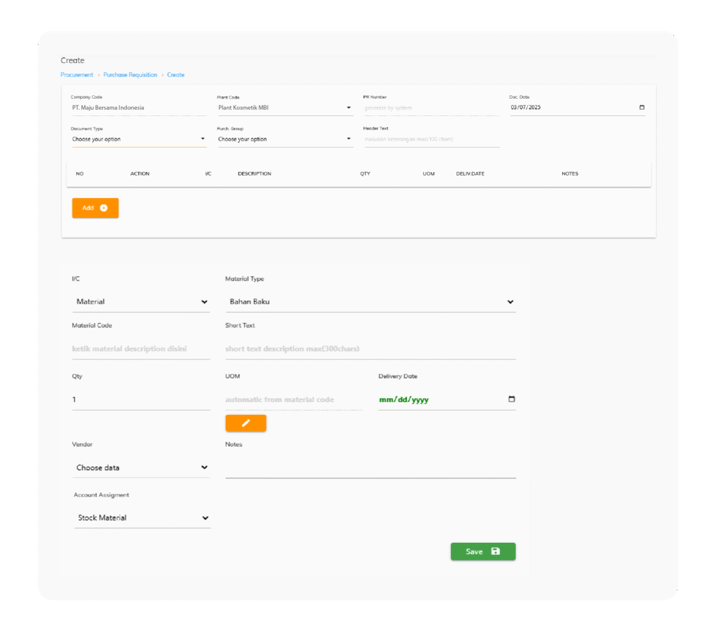 Purchase Requisition (PR) merupakan menu yang menjembatani user untuk membuat permintaan baik material maupun jasa kepada bagian purchasing. Pada menu ini terdapat beberapa poin yang dapat tercatat pada system, meliputi :