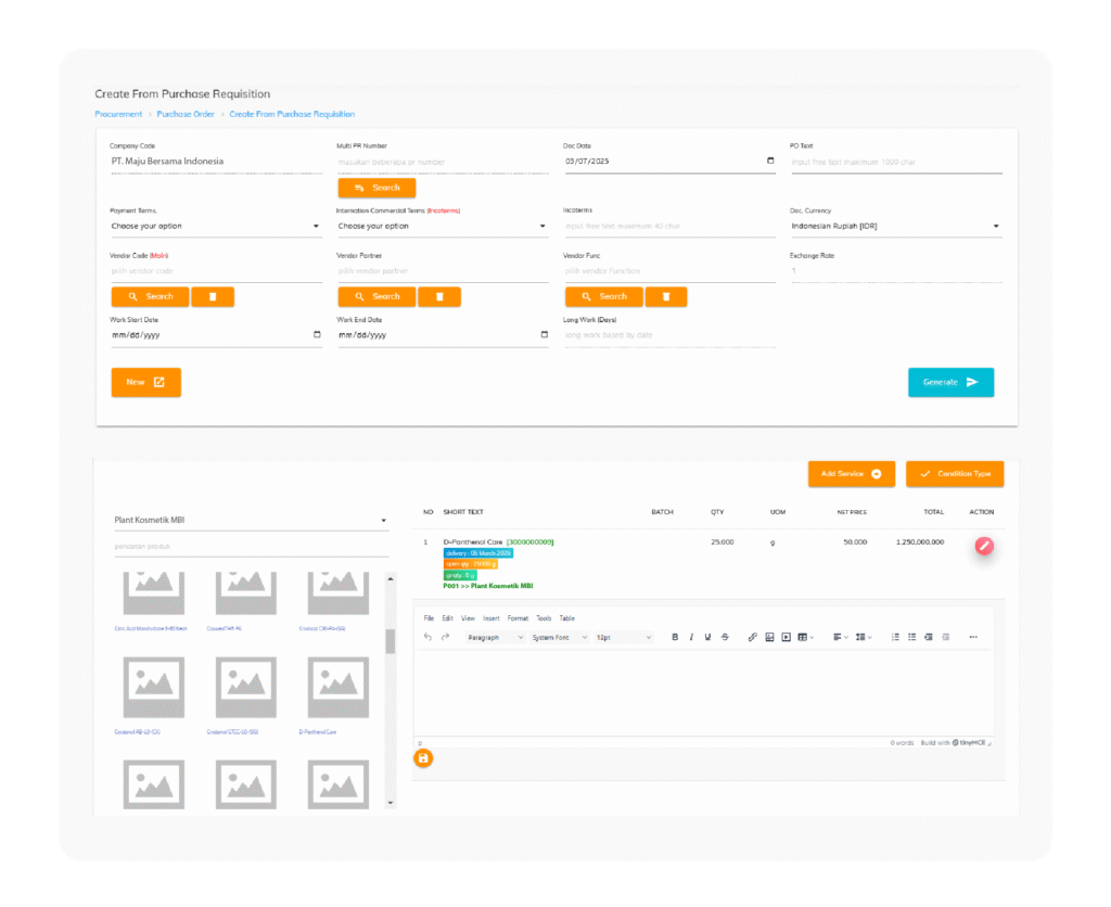 Purchase Requisition (PR) dapat diteruskan menjadi Purchase Order (PO) setelah approve oleh kepala bagian pembuat PR. Bagian Purchasing akan menunjuk pihak Vendor dan melakukan kesepakatan atas harga dari barang yang akan di pesan. Dalam satu PO dapat terdiri dari beberapa PR dengan tujuan Vendor yang sama. Pada menu ini terdapat beberapa poin yang dapat tercatat pada system, meliputi :