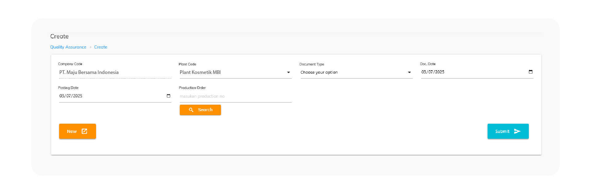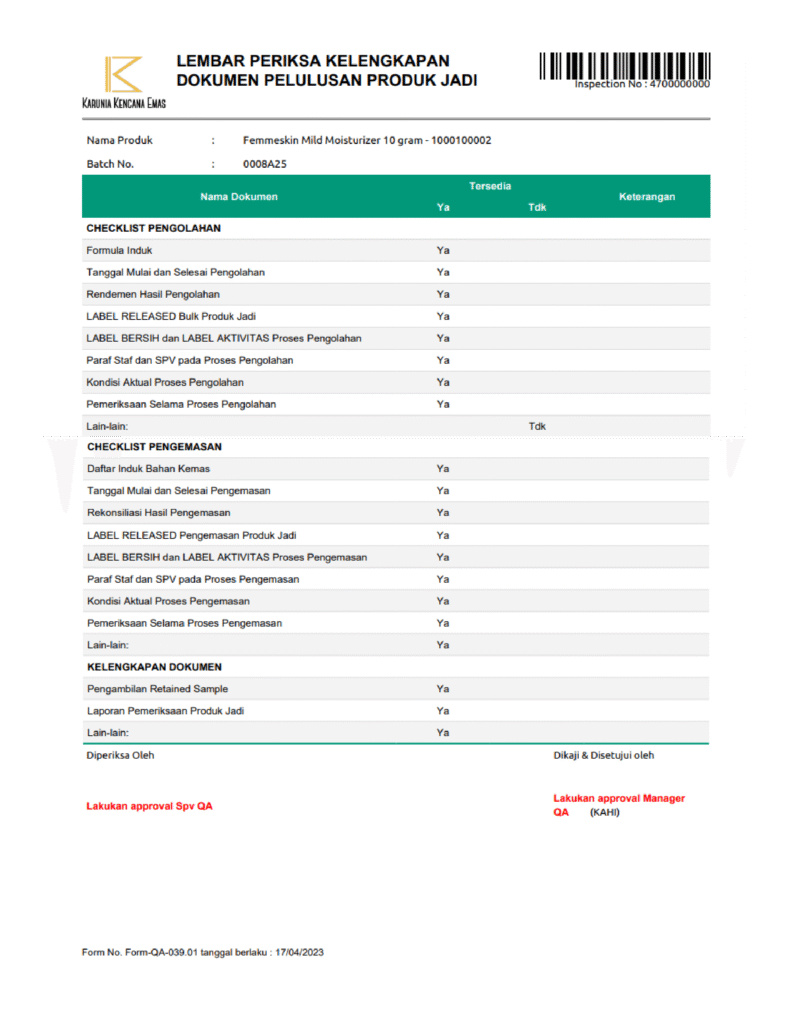 Menu QA dipergunakan untuk memastikan mutu produk hasil produksi sudah sesuai dengan standar atau tidak. Modul ini memastikan tersedianya kelengkapan dokumen pada batch record berdasarkan checklist pada system dengan outputnya Lembar Periksa Kelengkapan Dokumen Pelulusan Produk Jadi.