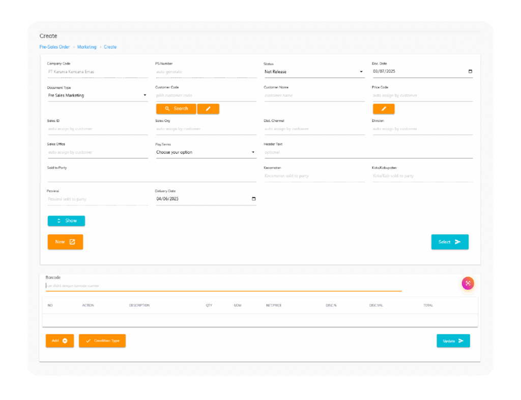 Pre-Sales Order merupakan menu yang dapat membantu bagian marketing atau penjualan memasukkan data pesanan penjualan yang dipesan oleh customer. Selain itu menu ini juga bermanfaat untuk perhitungan forecast pada Departemen PPIC untuk membantu menghitung kebutuhan produksi. Pada menu ini terdapat beberapa poin yang dapat tercatat pada system, meliputi :