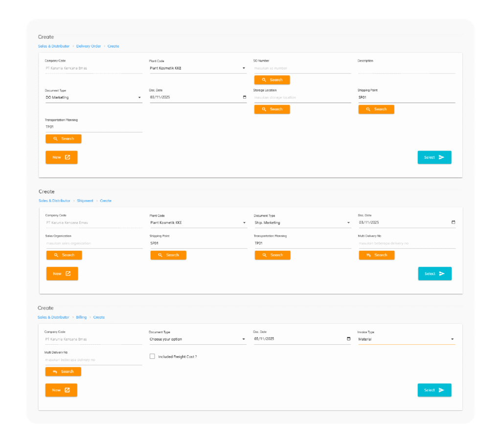 Menu Delivery Order sebagai menu pertama pada bagian distribusi produk ketika Sales Order sudah terpenuhi. Secara teknis, menu ini akan men-assign Batch yang akan dikirim ke Customer sesuai ketersediaan stock. Menu selanjutnya yaitu Shipment, pada proses ini, data Delivery Order yang siap di kirim ke Customer akan dibuatkan dokumen pengirimannya melalui menu Shipment ini. Menu terakhir pada Modul Distribusi yaitu Billing, pada saat data shipment terbentuk dan produk siap dikirim ke Customer, maka secara paralel dokumen penagihan atau Billing akan di cetak untuk dilampirkan bersama surat jalan.